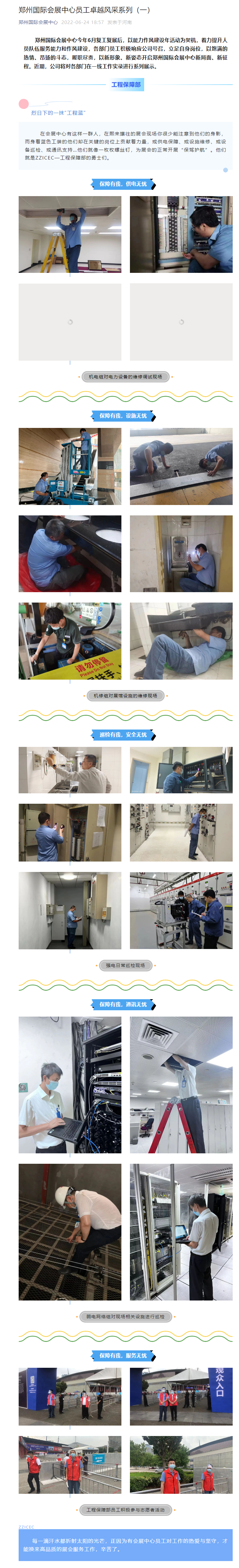 首頁新聞中心展會新聞文章詳情 文章詳情 鄭州國際會展中心員工卓越風采系列(一) 鄭州國際會展中心今年6月復工復展后,以能力作風建設年活動為契機,著力提升人員隊伍服務能力和作風建設,各部門員工積極響應公司號召,立足自身崗位,以飽滿的熱情、昂揚的斗志,履職盡責,以新形象、新姿態(tài)開啟鄭州國際會展中心新局面、新征程。近期,公司將對各部門在一線工作實錄進行系列展示。